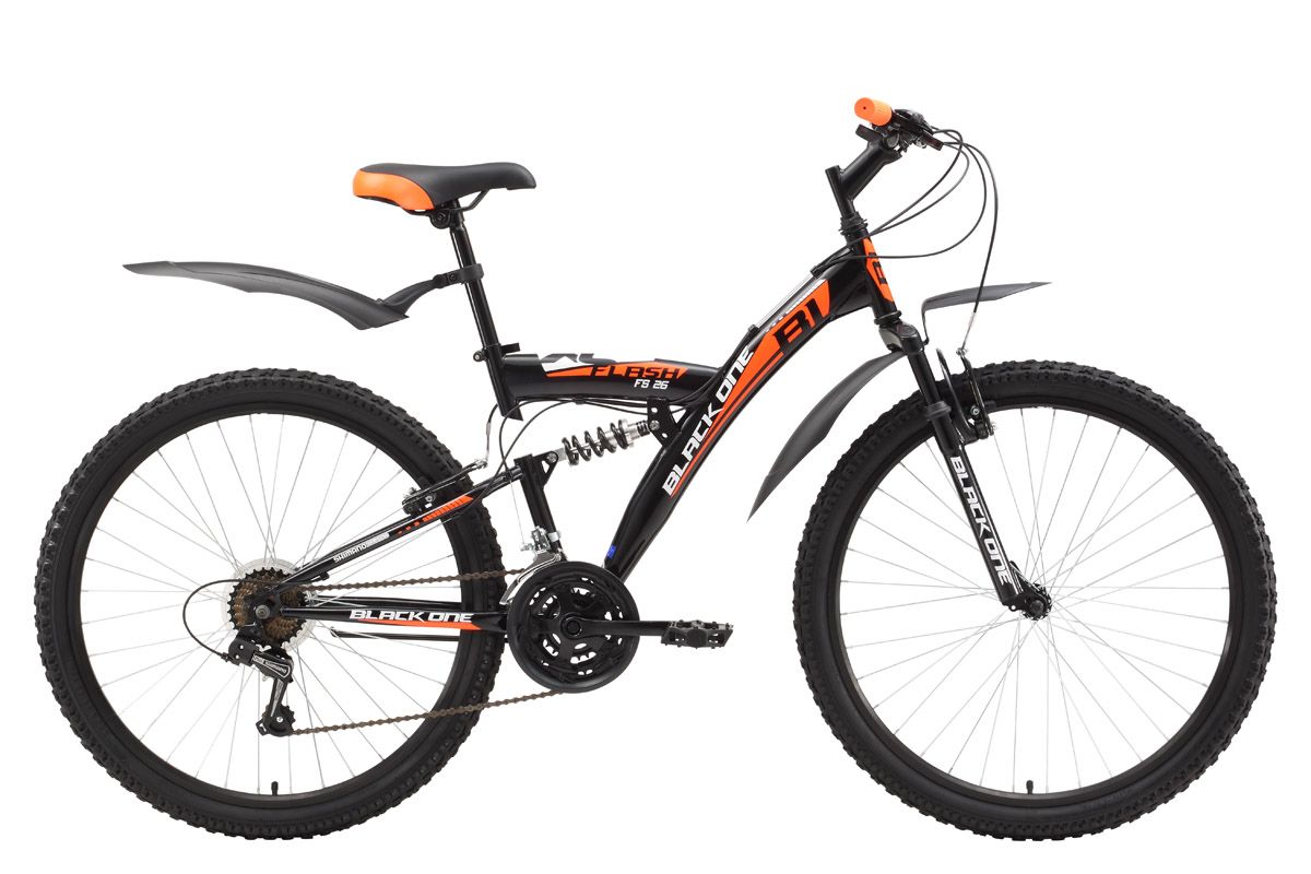 Недорогой и комфортный двухподвес, отлично подходит тем, кто любит совершать прогулки на природе. Передняя и задняя подвеска хорошо гасит неровности дороги и делает велопрогулки комфортными. Необходимая скорость легко подбирается с помощью 21 скоростной трансмиссии и курковых переключателей. Велосипед оборудован надёжными ободными тормозами типа V-brake. Пластиковые крылья и подножка придают велосипеду наибольший комфорт. Для эксплуатации в условиях бездорожья, по грязи и снегу рекомендуется использовать вариант велосипеда с дисковым тормозом – Black One Flash FS 26 D.